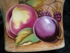Probably the best-known and most popular of the Aynsley designs, the fruit design was brought out to compete (in a lower-budget range) with Royal Worcester's fruit designs. Most of the hand-painted pieces (which are hand-finished over a transfer printed design) were completed by Doris Jones and Nancy Brunt, and their names or signatures are found printed or handwritten on most pieces. Doris Jones and Nancy Brunt worked at Aynsley from 1938-1969 and 1935-1975 respectively.