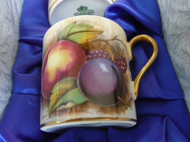 In the late 1970s, with the development of advanced transfer techniques, Aynsley's production of the fruit design switched away from the expensive handpainting. At this time, the name "Orchard Gold" was instigated, and production continues to this day under that name. These pieces are still the most expensive in the Aynsley range, because the application of the colours requires several firings. However, they are not hand-painted. Many items from this range are available on eBay at any time, and they can also be bought from fine china retailers throughout the world. Check the range on the Aynsley company website.