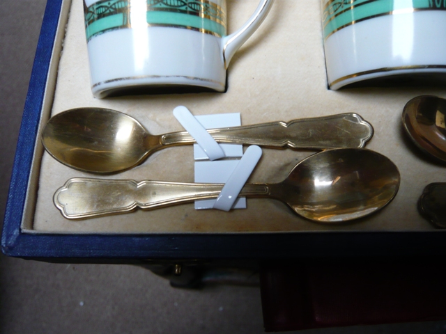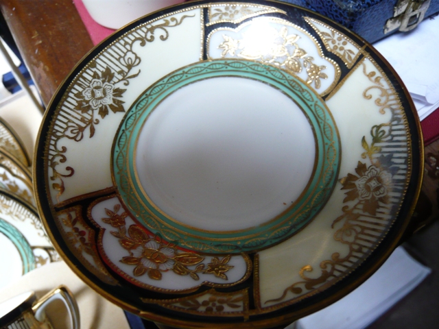the cups saucers have no damage cracks chips etc one cup seems to have minor wear and some of the saucers slight wear to the gold inner circle... more out of handling than use gold coloured spoons have no name and have some small marks on them |