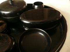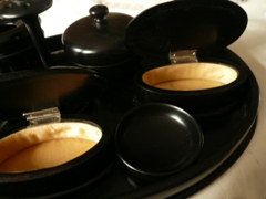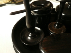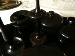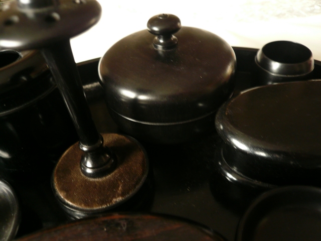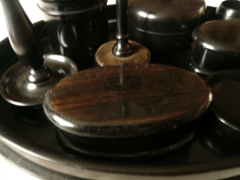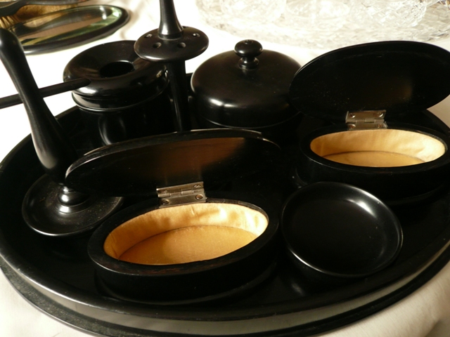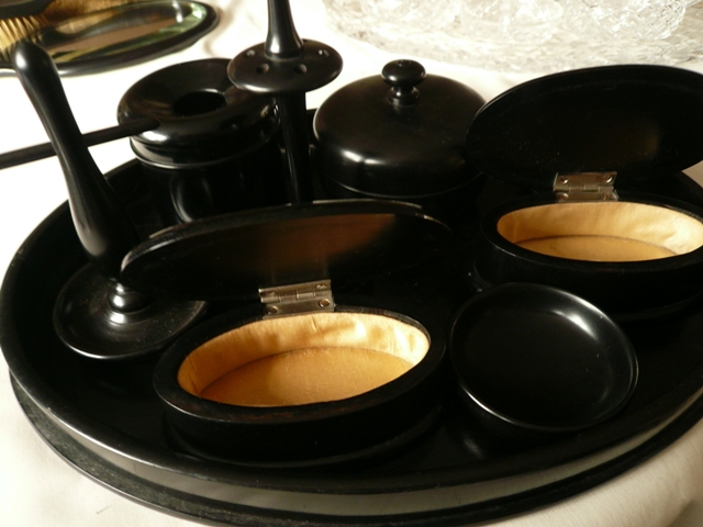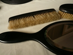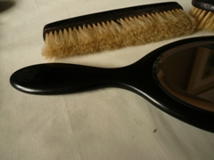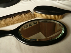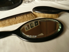 1 dish 1 1/2 inches high 1 3/8 inches in diameter 1 screw lid trinket 2 3/4 inches high 2 manicure boxes 2 clothes brushes and a mirror |